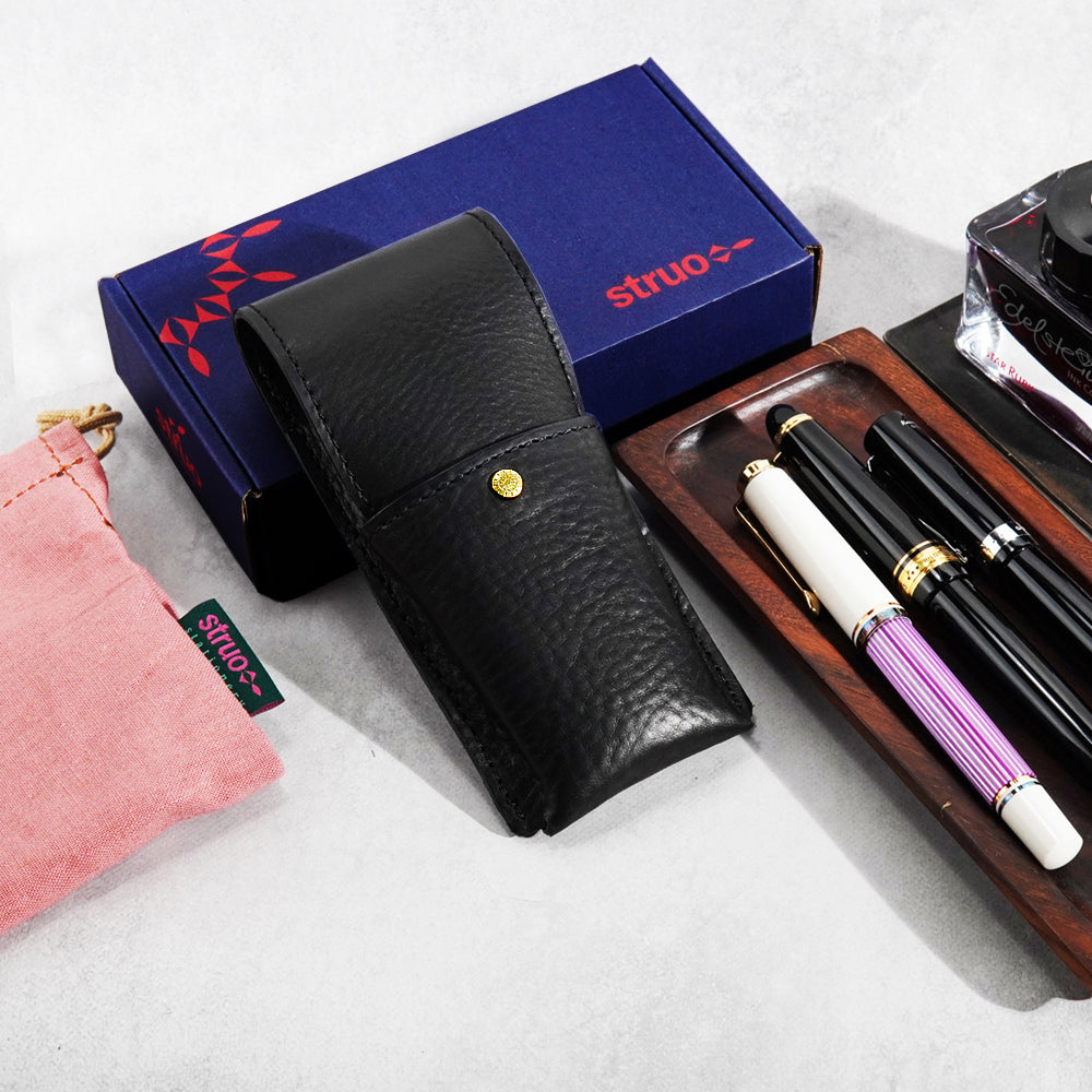 ■独自性を極めたSTRUO革の万年筆ペンケース3本用・蓋付きモデル。■高級万年筆ペリカン・スーベレーンm600に合わせて制作した、機動力に優れたモデルです。少し短めの長さ(133mm)でキャップ径14mmの太さ。この独特なサイズにマッチします。スーベレーンm800、m600、m400の中でもm600を好まれる方におすすめです。