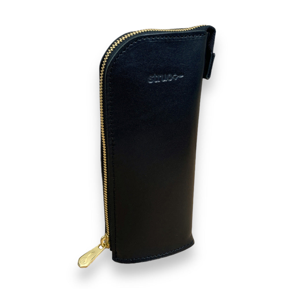 日本を代表する皮革・栃木レザーを使用。ピット槽による植物タンニン鞣しで、染色後にオイル・ワックスを入れています。ヌメ革の高級感が漂う仕上がり。光沢感がます黒色のエイジングはケースへの愛着を深める事でしょう。また、高級ファスナー・YKK"エクセラ"を採用することで滑らかな開閉を実現しています。留め金具は真鍮製のSTRUOオリジナル。味わい深い経年変化が期待できます。